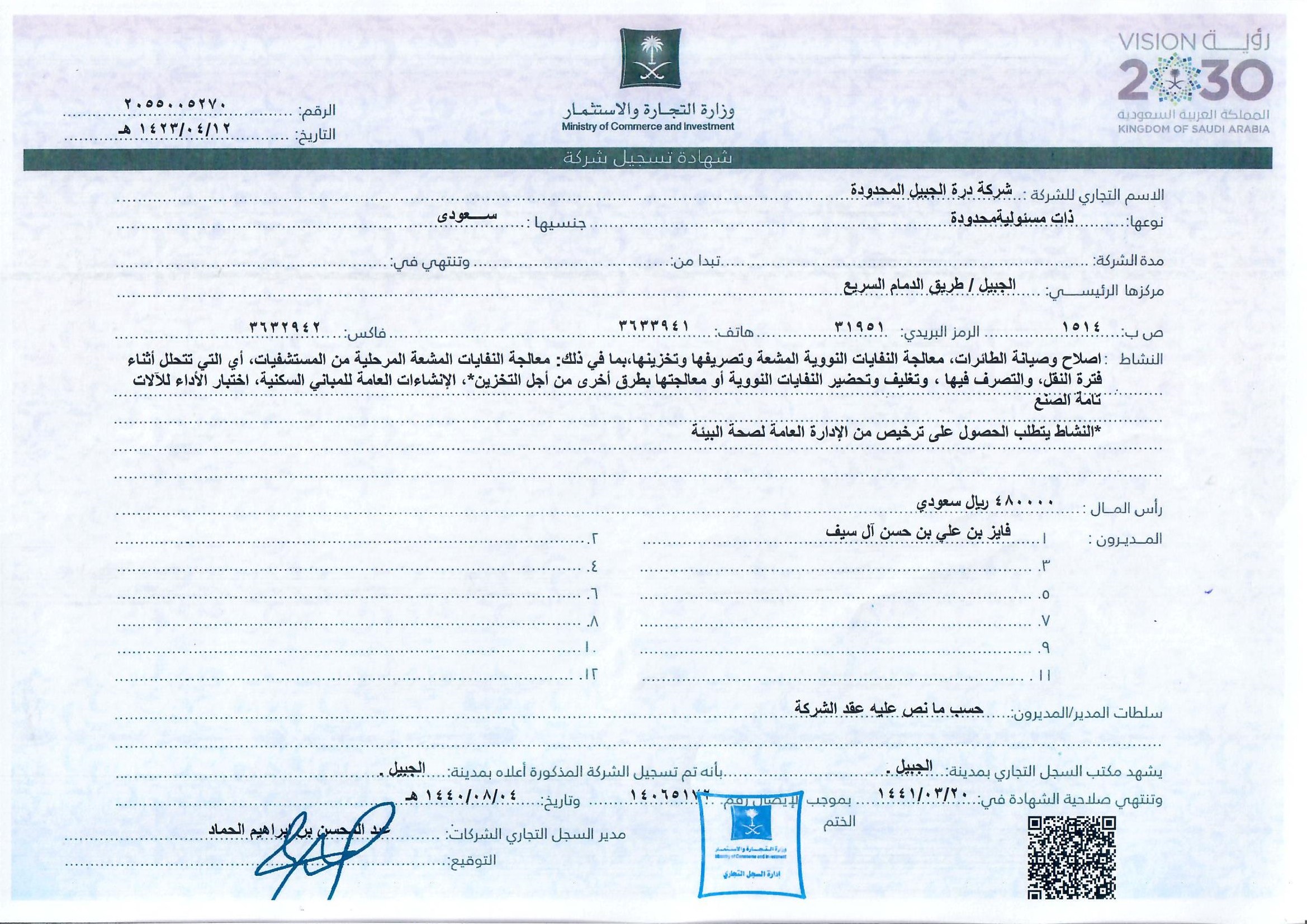 This document—called the Commercial Registration (CR) or “Sijil Tijari” in Arabic—is an official license issued by the Saudi government that proves the company is legally registered and authorized to operate in Saudi Arabia.